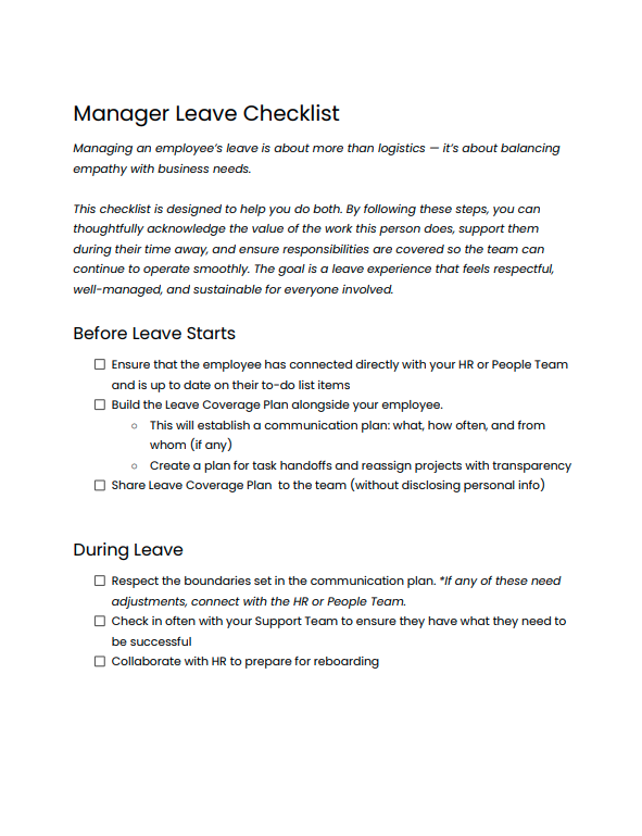 This Manager Leave Checklist gives people leaders a clear, step-by-step framework for navigating leave before it starts, while an employee is away, and as they return. It helps you thoughtfully acknowledge the value of your employee’s work, ensure responsibilities are covered without unnecessary disruption, and create a leave experience that feels respectful and well-managed for everyone involved.