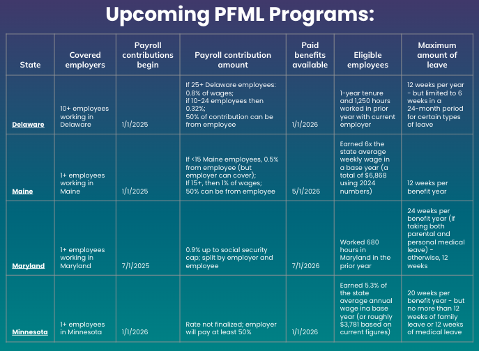 Mandatory PFML programs:Delaware, Maine, Maryland, and Minnesota will start providing benefits to eligible employees in 2026.