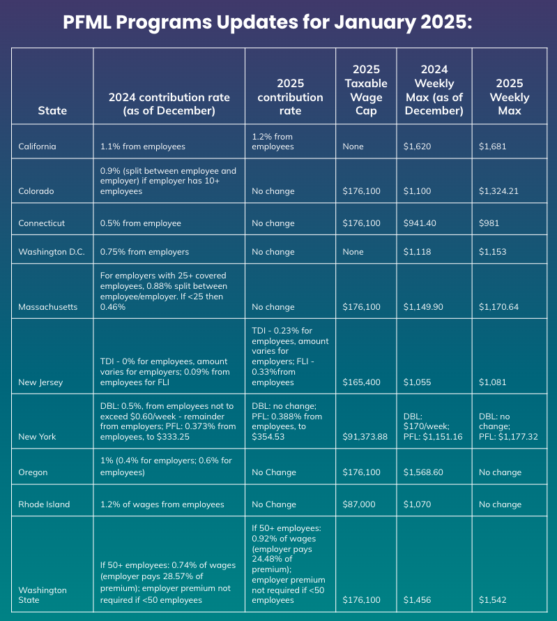 In January, many of these programs will implement updates to employer and/or employee contribution rates, taxable wage caps and weekly benefit maximums.